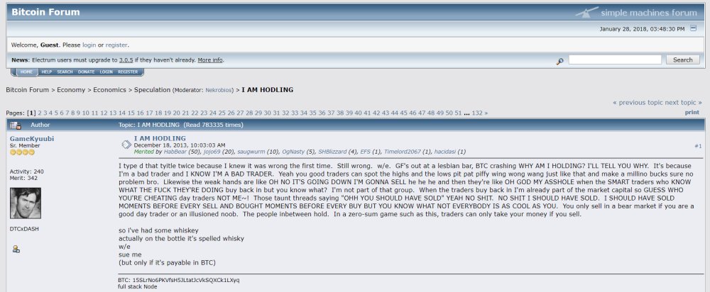 Der Ursprung war ein Eintrag in einem Internetforum in welchem einer der User namens „Gamerkyuubi“ sich in betrunkenem Zustand darüber beschwert hat, dass er ein schlechter Trader ist und in Zukunft seine Bitcoins nur noch Halten und nicht mehr damit Handeln will. Er vertippt sich im Titel und schreibt „I AM HODLING“ .